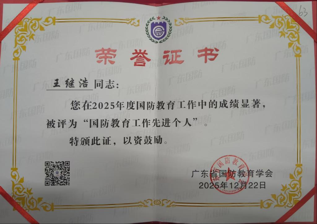 近日,由广东省国防教育学会主办的2025年度工作会议在东莞举行。广州理工学院因本年度成绩突出,在本次会议上被授予“2025年度国防教育工作先进单位”称号和王继浩老师获“2025年度国防教育先进个人”称号。